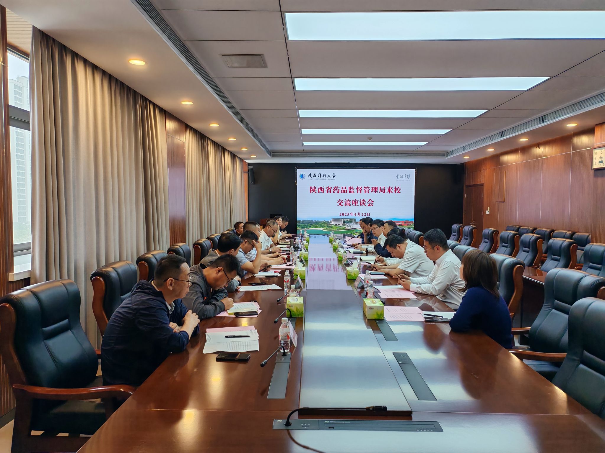 4月22日,陜西省市場監督管理局黨組成員、省藥品監督管理局黨組書記、局長馮鋒帶隊來校調研交流。校長黃劍鋒出席座談會并致辭,副校長陸趙情主持座談會。