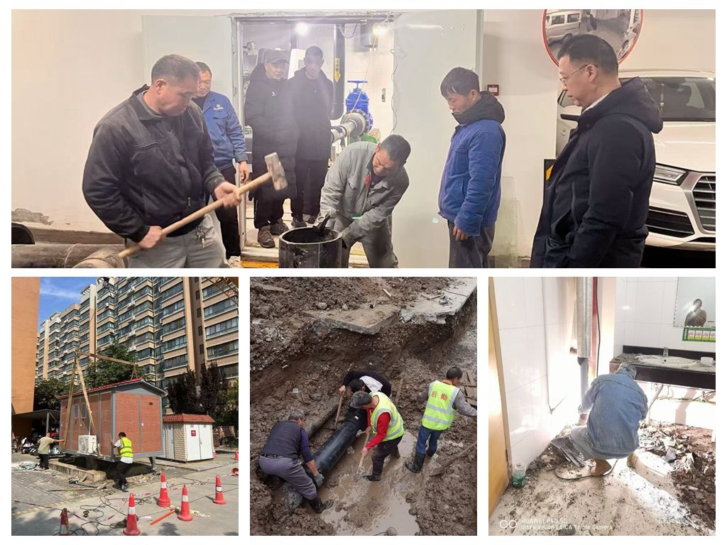 2025年1月27日,家屬區(qū)自來水主管網(wǎng)突發(fā)爆裂,后勤團隊連夜集結(jié),多方聯(lián)系協(xié)調(diào),與西安市自來水公司協(xié)同作戰(zhàn)26小時,克服配件短缺、施工復(fù)雜等難題,在嚴寒中完成搶修任務(wù),恢復(fù)供水。