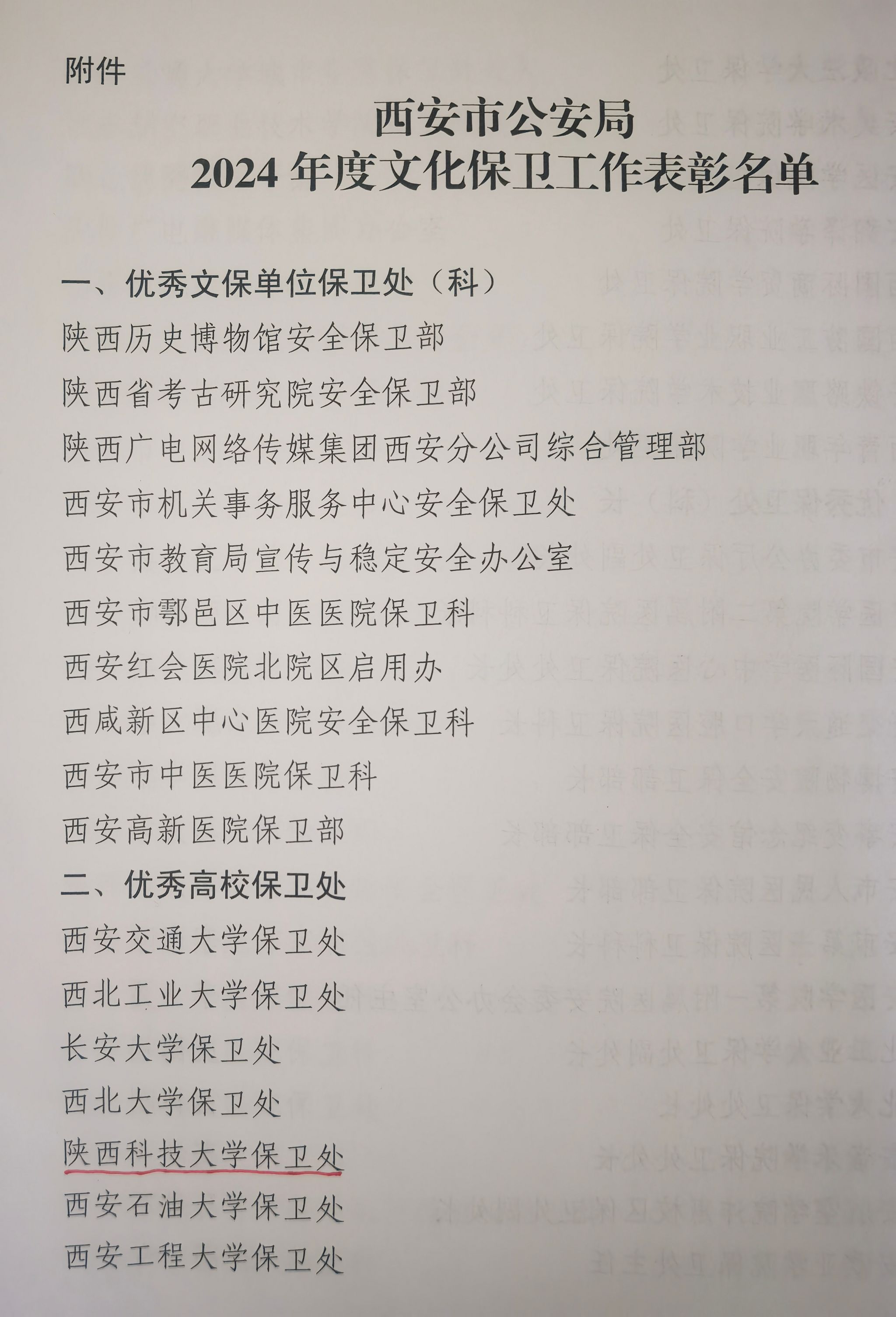 近日,西安市公安局發布《關于表彰2024年度文化保衛工作優秀集體和優秀個人的決定》,我校保衛處憑借扎實的工作作風和突出的安全保衛成效,被授予“2024年度文化保衛工作優秀保衛處”榮譽稱號。這是對我校安全管理工作的高度認可,也是全體保衛人員戮力同心、擔當盡責的成果體現。