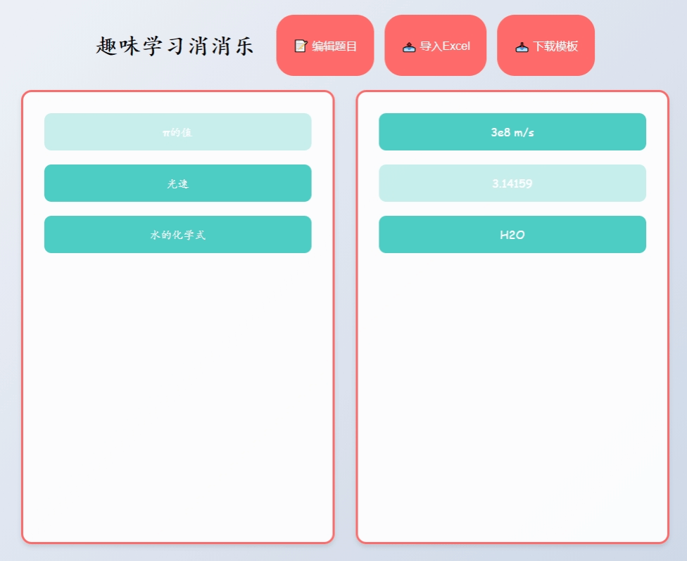 “趣味消消樂”提示詞:幫我制作一個(gè)針對學(xué)習(xí)的連連看游戲網(wǎng)頁,淺色背景。分左右兩列,左邊一列為問題,右邊一列為答案,左右選擇正確后消除,且左邊問題和右邊答案亂序排列。問題和答案提供一個(gè)可編輯頁面供老師編輯問題和答案。同時(shí),也提供下載的excel模板,有導(dǎo)入excel按鈕功能。