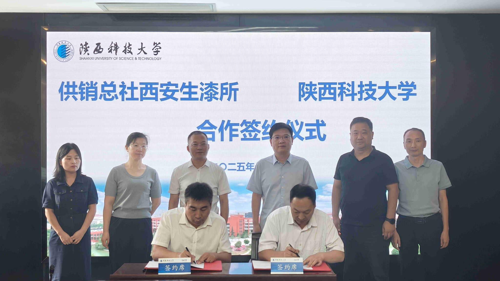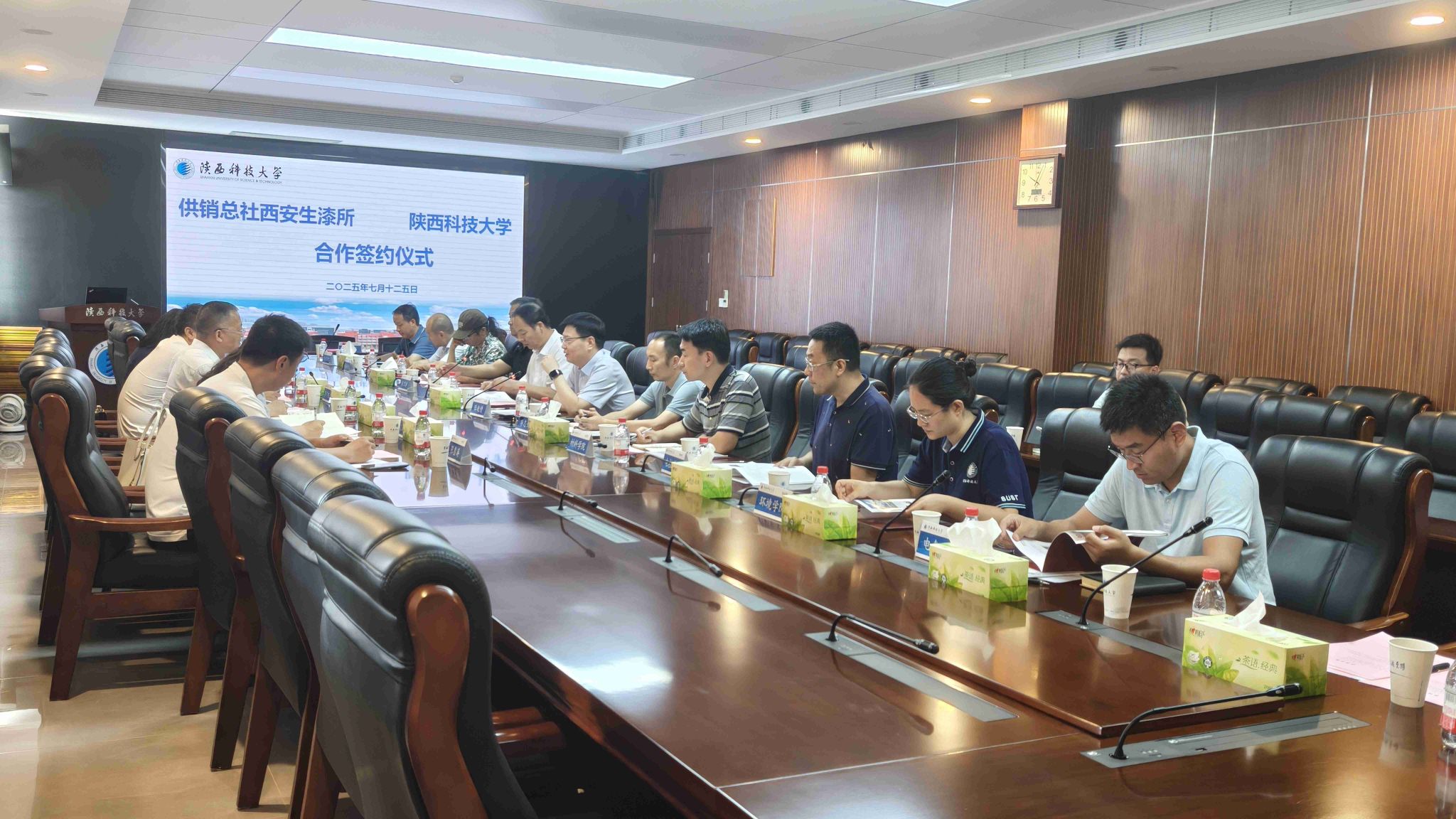 7月25日,中華全國供銷合作總社西安生漆涂料研究所黨委書記、所長趙瑞,黨委委員、副所長李東旭等一行來陜西科技大學座談交流,黨委委員、副校長陸趙情出席座談,科技處處長朱建鋒主持座談會。