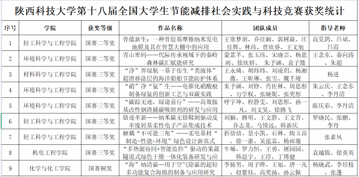 8月8日-11日,由教育部高等學校能源動力類專業教學指導委員會指導、全國大學生節能減排社會實踐與科技競賽委員會主辦的第十八屆全國大學生節能減排社會實踐與科技競賽決賽在東北石油大學落下帷幕,本屆大賽共收到31個省份、692所高校的7736件參賽作品,以及254件產業賽道作品,吸引55000余名優秀學子報名參加。陜西科技大學在該項賽事中榮獲二等獎2項、三等獎6項及產業賽道銅獎1項,并榮獲全國高?!皟炐憬M織獎”。