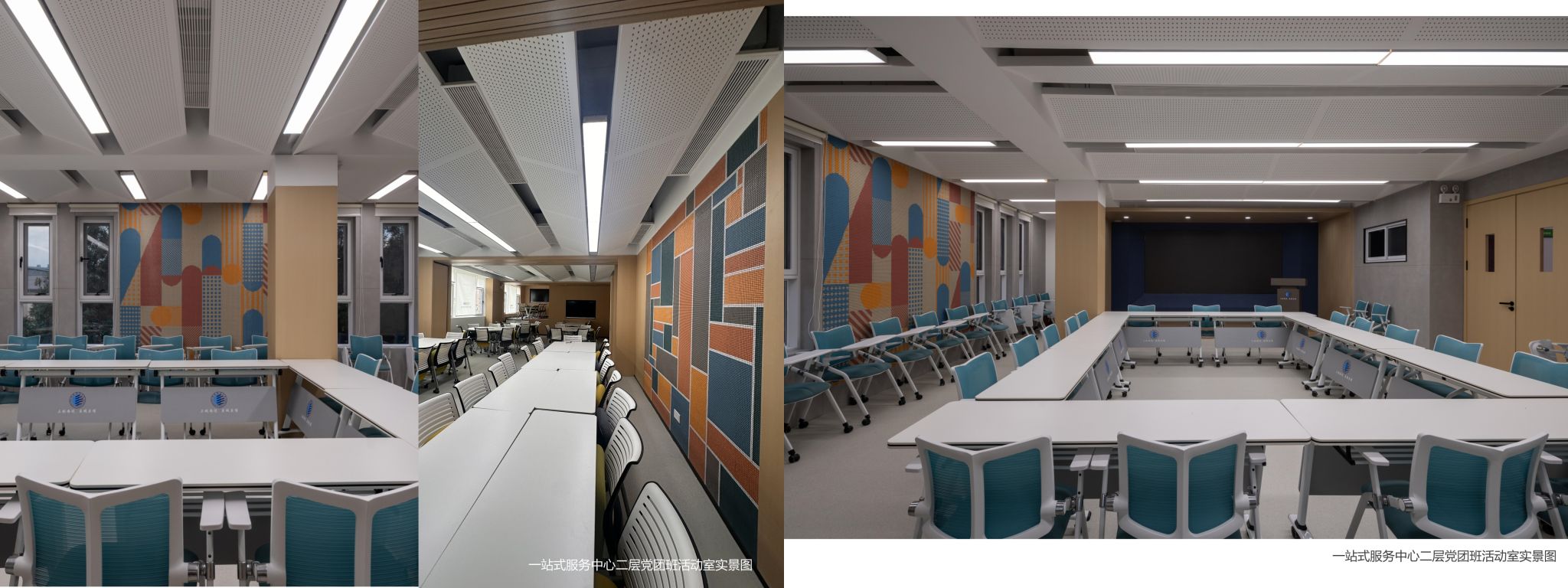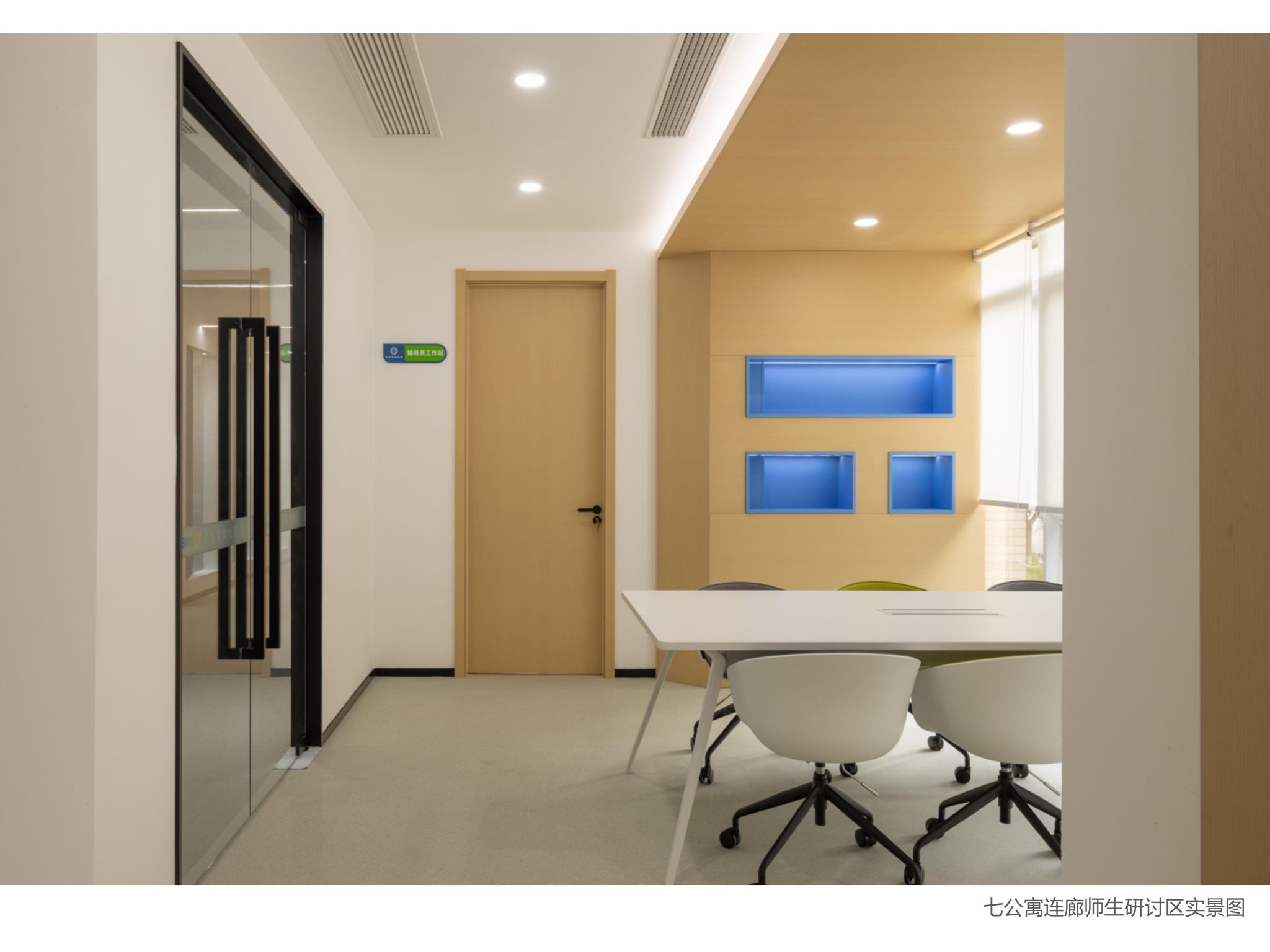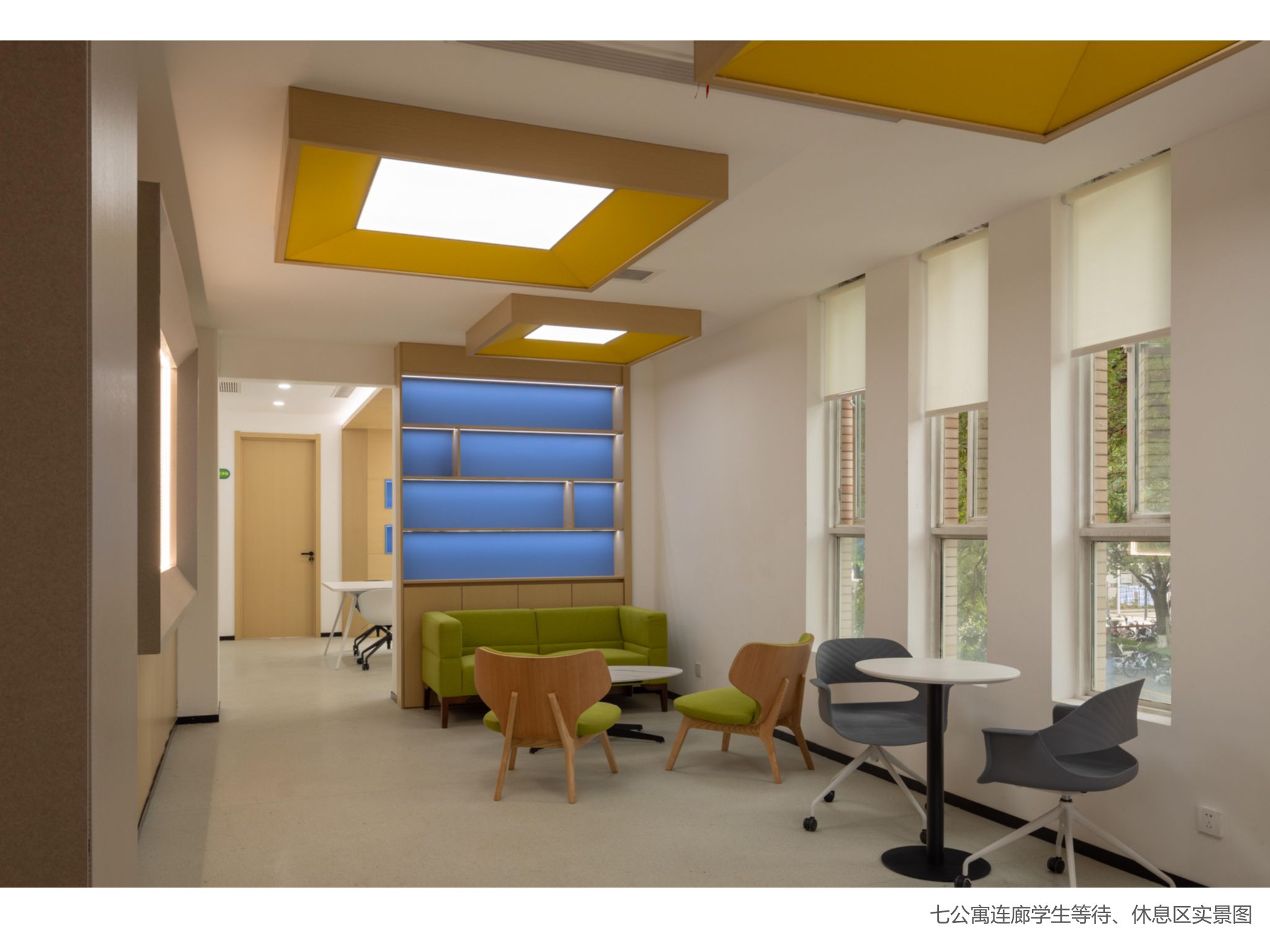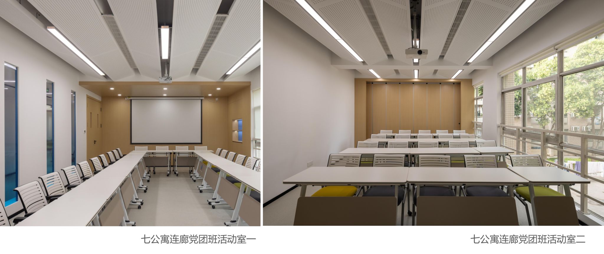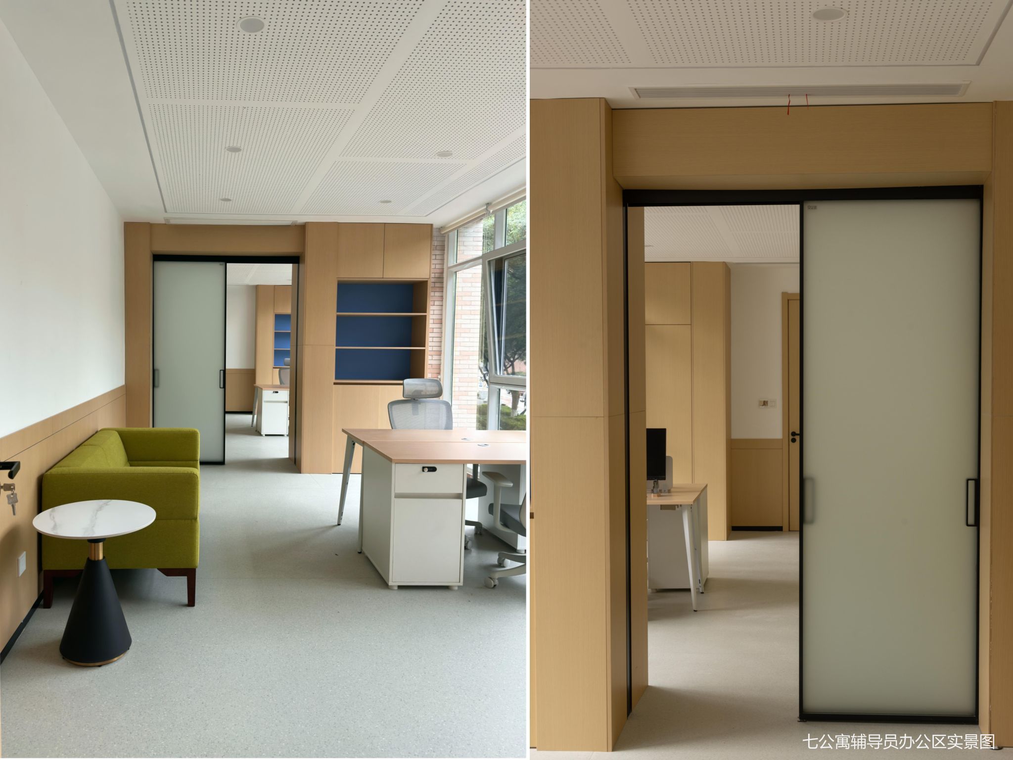 與此同時,學校還將學生七公寓作為“1+N”布局的第一個試點建設社區服務站進行了改造,建成了服務于輔導員入駐、各育人主體下沉和黨團班集體活動的多功能空間。公寓連廊一二層設有4間8個工位的輔導員辦公室,滿足該公寓學生帶班輔導員的入駐辦公需要;一樓大廳外設有開放式黨團班共享會議室,大廳內重新改造裝修,面貌煥然一新,閱讀書柜、舒適沙發一體配備,成為學生日常休憩、互動交流的新空間;連廊二樓專門外加鋼構樓梯,實現動線獨立分流,為各班級集中開展活動提供便利的專用通道,內設有研討區、學生等待休息區,建有黨團班活動室,多媒體互動屏、移動桌椅一應俱全,折疊門可以根據使用人數靈活調整空間大小,既能承載兩個班體量的大規模集體活動,也能適應小范圍的小組討論,實現了空間利用最大化,也為學校各育人力量進公寓開展工作提供了場地及設備保障;談心談話室精心建設,舒適的沙發、溫暖的墻面配色,為師生咨詢談話提供了私密、安靜、舒適的空間。社區服務站的試點建成為我校推動各育人力量下沉社區,輔導員及時響應學生訴求、就近就便開展教育管理服務工作,推進"服務到樓、關懷到人"理念落實,實現"小事不出樓宇,大事不出社區"目標提供了空間環境保障。