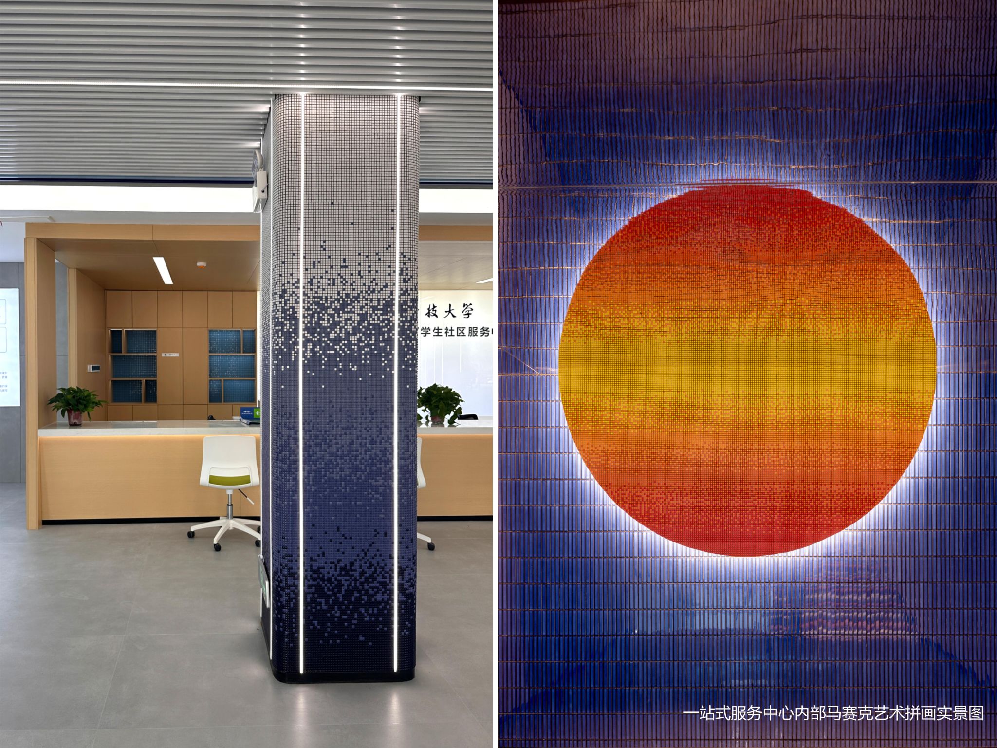 "至誠至博"一站式學生社區服務中心的建筑外觀現代簡潔,內部空間功能合理,陶瓷材質的天然美感既充分體現我校輕工專業特色,又與校園空間相得益彰融合,外墻磚的色彩搭配和諧統一,室內外馬賽克藝術拼畫既展現了現代材料美學和空間美學的結合,為社區環境注入了藝術活力,為廣大學生創造了既實用又美觀的學習生活空間,進一步推動學生社區從單純生活場所轉變為教育生活成長共同體的育人場域。