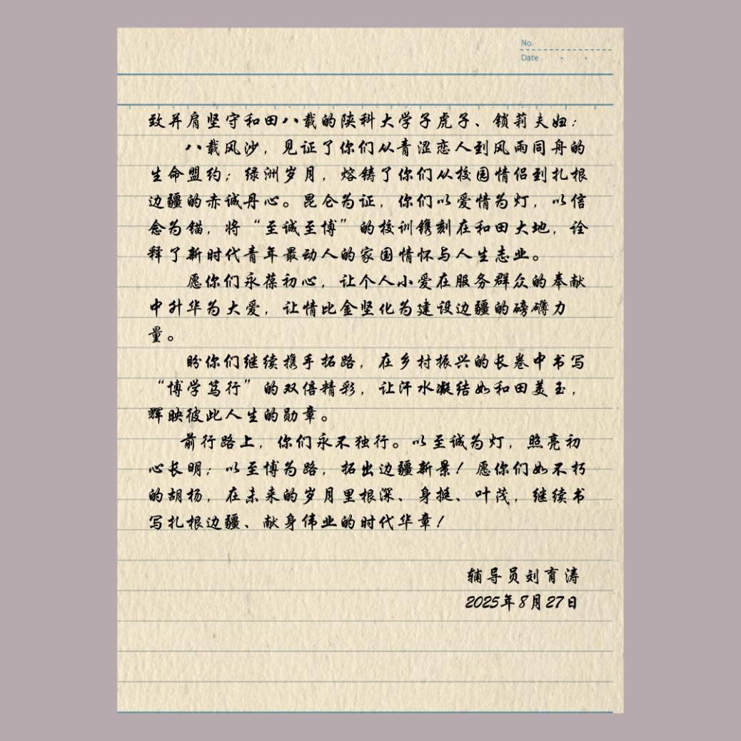 “渭水同窗,昆侖共守”,李虎與馮鎖莉的故事,未有驚天動地的壯闊波瀾,卻蘊藏著直抵人心的精神力量。這份力量,是伴侶間的相契與篤行——從陜西科技大學校園里的并肩求索,到和田邊疆的風雨同舟,他們以愛為舟楫,將小家的溫情揉進邊疆的日月,讓“相守”不再是單薄的承諾,而是浸潤在柴米油鹽與守望相助里的具象人生;是共產黨人的初心與擔當——以信念為錨點,扎根于塔克拉瑪干沙海之畔,在走村入戶的奔波、服務鄉親的瑣碎里,踐行著“到祖國最需要處去”的誓言,讓“奉獻”脫離空泛的口號,成為浸潤在每一次解民憂、紓民困中的實在行動;更是陜科大學子的赤誠與風骨——攜著對土地的敬畏、對責任的恪守,將青春的印記深深鐫刻在昆侖山腳下的熱土之上,讓“成長”不再是個人的踽踽獨行,而是與邊疆發展同頻共振的雙向奔赴。