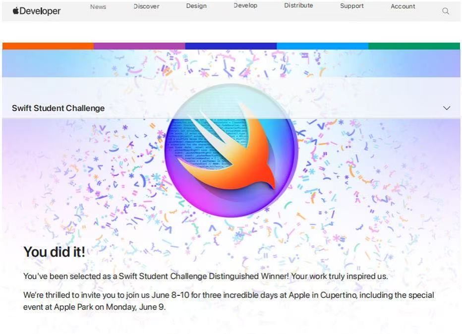 蘋果公司自2020 年開始舉辦Swift Student Challenge賽事,旨在支持和激勵新一代開發者、創作者和企業家。要求在 App Playground 中創建一個互動式場景,并提供不超過三分鐘的體驗。挑戰賽為學生開發者提供通過 App Playground 展現自身的創造力和編程能力的機會,并從中學習到可以在職業生涯和更多地方運用的實際技能。主辦方將選出 350 名 Swift Student Challenge 獲獎者,以表彰在創新思維、卓越創意、社會影響或多元包容等方面表現出色的優秀作品。并最終從獲獎者中進一步選出 50 名杰出獲獎者(Swift Student Challenge Distinguished Winner),并受邀參觀位于美國庫比提諾的 Apple 園區。