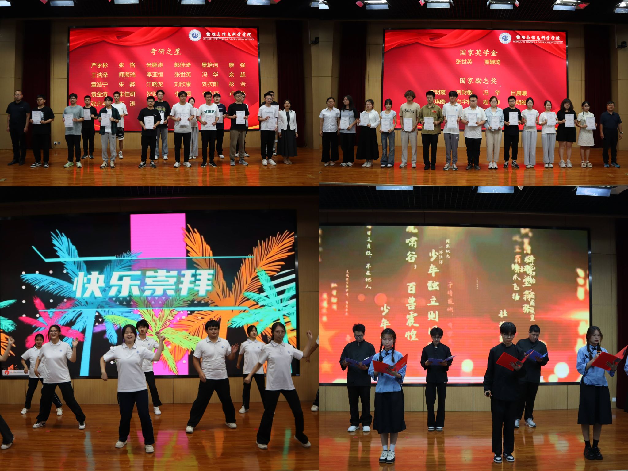 表彰大會氣氛熱烈、高潮迭起,文藝表演與頒獎環節交相輝映,榜樣分享與師長寄語深入人心,充分展現了物理學子昂揚向上的精神風貌和學院在人才培養方面取得的豐碩成果。展望未來,物理學院將始終堅守“立德樹人”根本任務,縱深推進學風建設,著力促進學生全面成長與卓越成才。