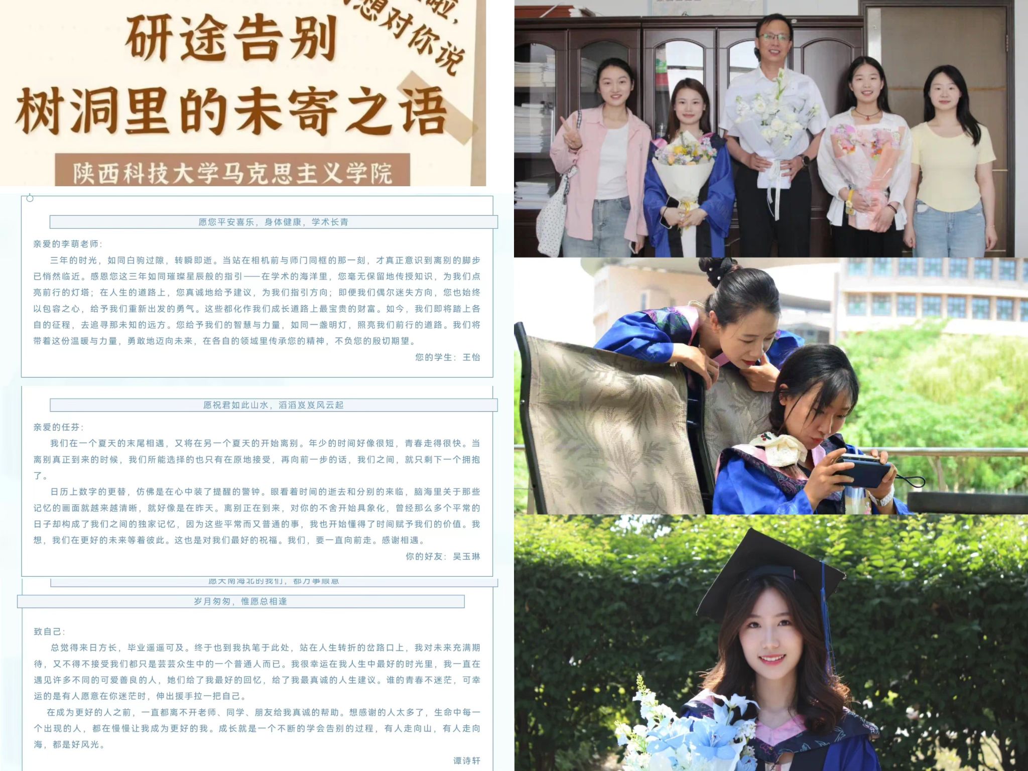 畢業的序章里總有一些未說盡的情愫藏在抽屜深處,學院開展“告別研途”樹洞征集活動,為2025屆畢業生搭建情感表達平臺。畢業生們通過匿名或署名方式,向導師、同窗或未來的自己投遞"心靈信箋",將那些藏在心底的感恩、期許與祝福化作文字。一封封真摯的書信,承載著畢業生們最深沉的情感。