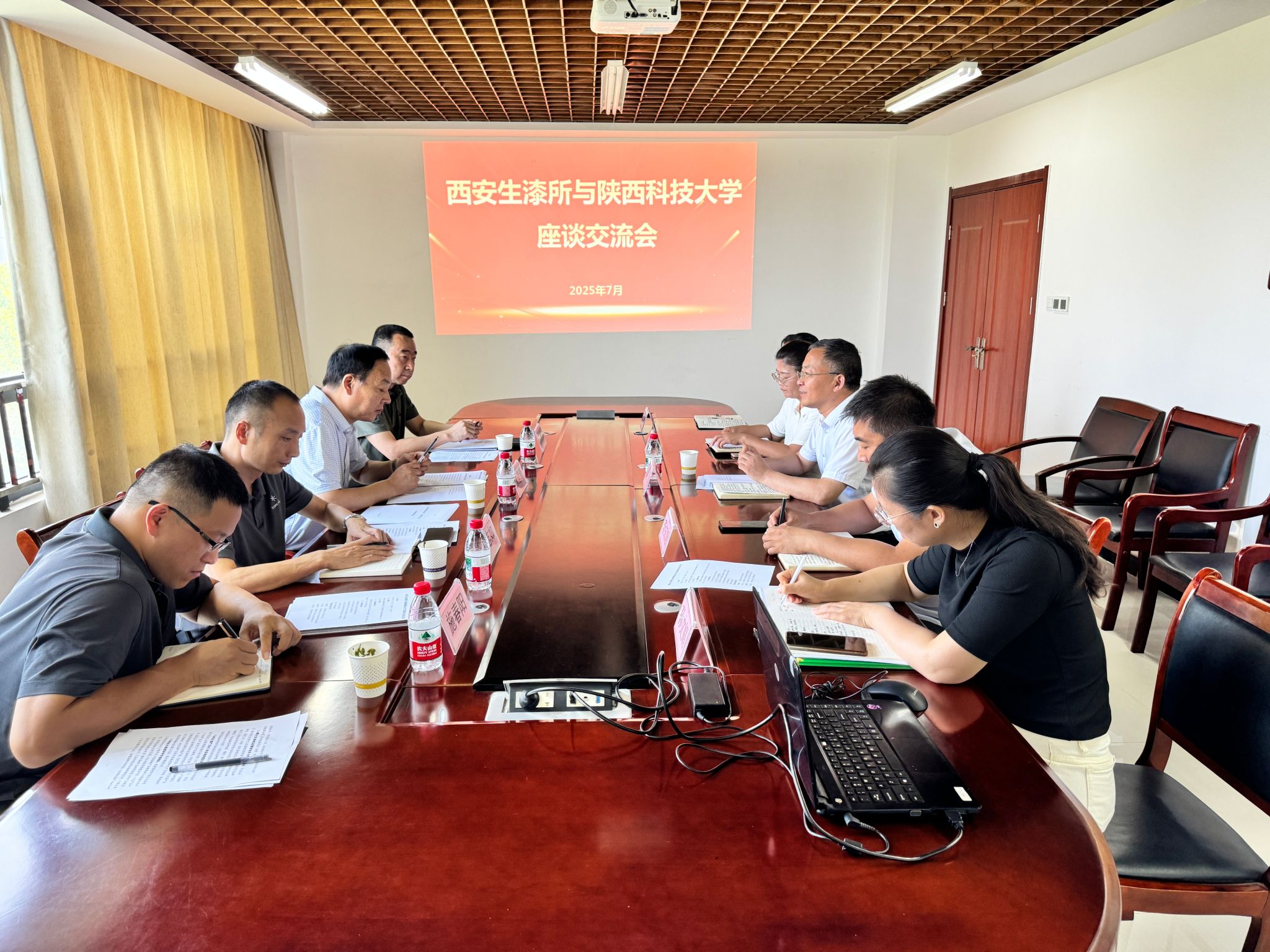 7月14日,陜西科技大學科技處處長朱建鋒率隊赴西安生漆涂料研究所開展合作對接交流,前沿科學與技術轉移研究院副院長李志如、陜西農產品加工技術研究院主任施春陽及商南東正集團董事長任戰洲等一同參加。西安生漆涂料研究所黨委書記、所長趙瑞及相關負責人熱情接待并參與座談。此次交流旨在進一步推動產學研深度融合,助力陜西生漆產業傳承創新與高質量發展。