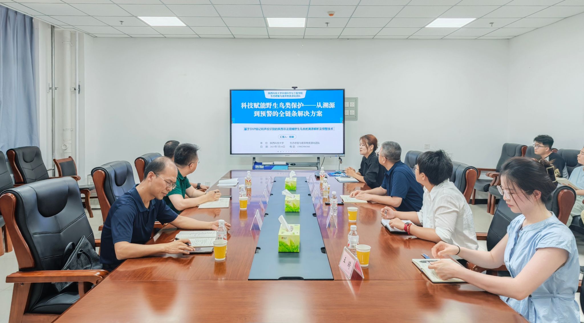 座談會上,趙杰詳細介紹了當前陜西省非法盜獵野生鳥類的現狀及面臨的挑戰,強調打擊此類犯罪行為對于維護生態平衡和生物多樣性的重要性。環境學院專家團隊重點介紹了野生鳥類的溯源解析和預警監測技術,雙方就如何利用環境DNA技術、鳥類聲紋技術以及大數據分析等手段,實現對野生鳥類棲息地的實時監測、盜獵行為的早期預警以及非法交易鏈條的精準追溯等進行了深入探討。