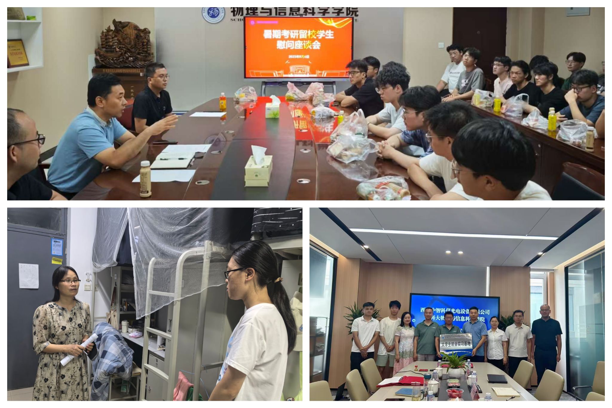 聚焦學(xué)生需求,延伸育人“服務(wù)鏈”針對暑期考研學(xué)生復(fù)習(xí)場地緊張的問題,學(xué)院積極協(xié)調(diào)實驗室、會議室等空間開辟為考研自習(xí)室,并配備桌椅、飲用水、網(wǎng)絡(luò)等基礎(chǔ)物資,為學(xué)生提供安靜便捷的學(xué)習(xí)環(huán)境。假期中段,學(xué)院專門召開“暑期考研留校學(xué)生慰問座談會”,院領(lǐng)導(dǎo)、系主任及輔導(dǎo)員與學(xué)生親切交流,傾聽備考困惑與需求,既為大家加油鼓勁,也送上貼心慰問品,讓學(xué)生在專注復(fù)習(xí)時更能感受到學(xué)院的溫暖。同時,學(xué)院專程前往中智科儀等企業(yè),看望慰問暑期在企實習(xí)學(xué)生,實地了解他們的實習(xí)環(huán)境與實際需求,為學(xué)生實習(xí)實踐全程保駕護航。