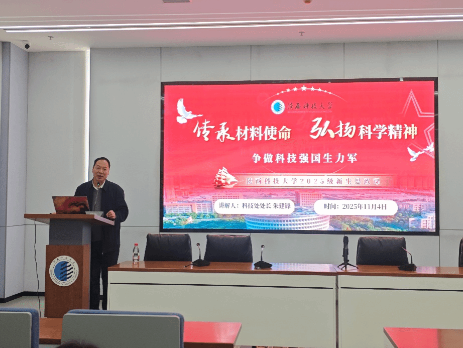 11月4日,科技處處長朱建鋒教授以《傳承材料使命,弘揚科學精神——爭做科技強國生力軍》為題,為材料學院2025級新生帶來一場別開生面的思政課。