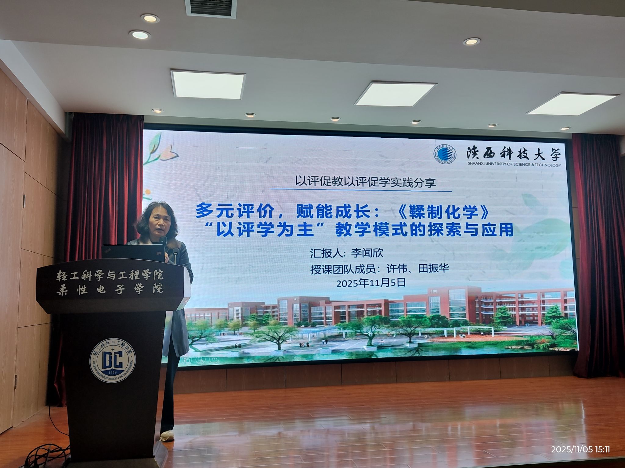 李聞欣以“多元評價,賦能成長:《鞣制化學》‘以評學為主’教學模式的探索與應用”為主題,從課程背景、課程設計與實施、多元評價體系重構以及實踐成效展示等四個方面向學院老師介紹了《鞣制化學》課程教學中“以評學為主”的教學模式。