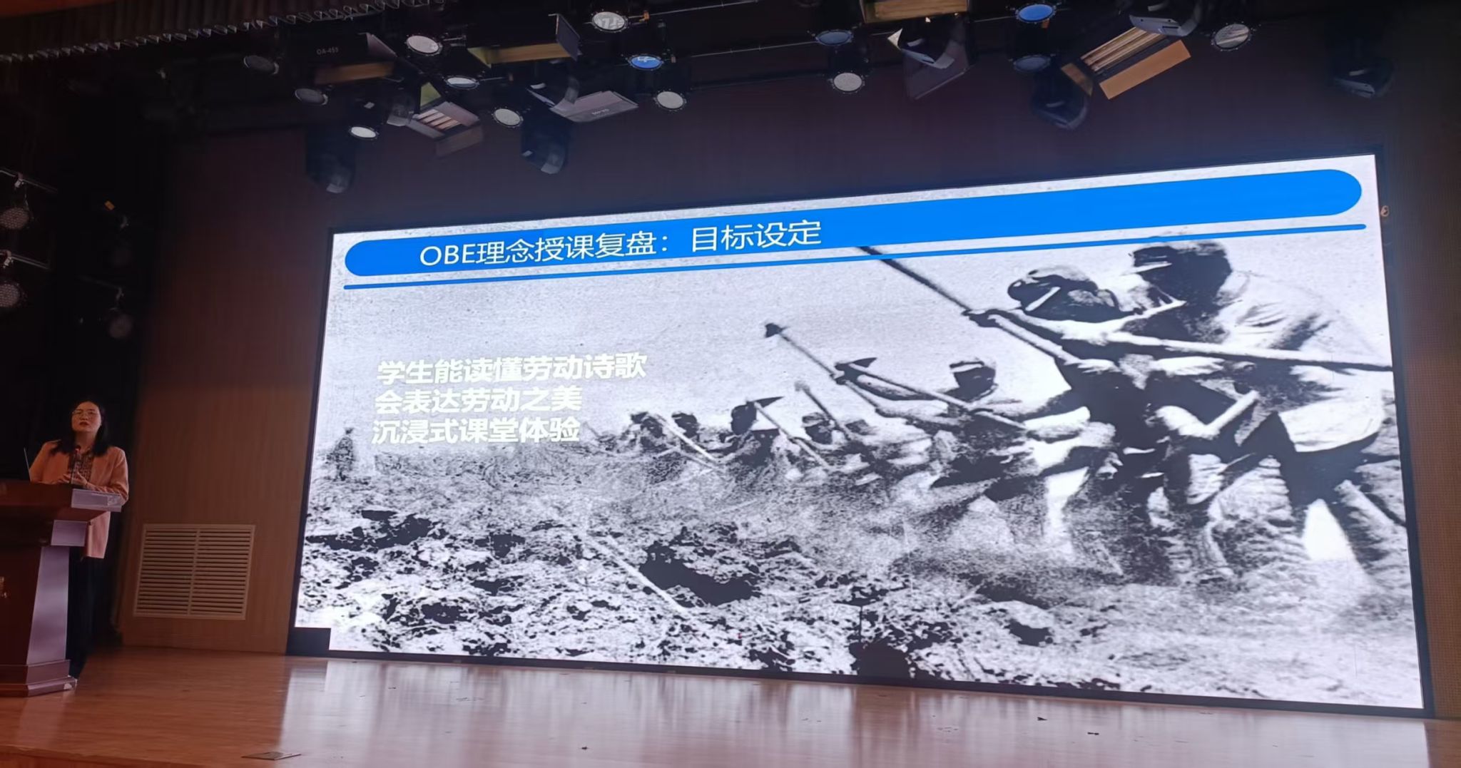 李靜以“抗戰(zhàn)時期的勞動主題詩歌教學及其反思”為切入點,從目標設定、任務清單、OBE理念落地、授課復盤,詳細的分析了教師如何運用理論聯系情景,運用啟發(fā)教學法、問題教學法、項目教學法、案例教學法等等,來塑造和提升學生的能力表達,使學生能夠沉浸式體驗課程的魅力。