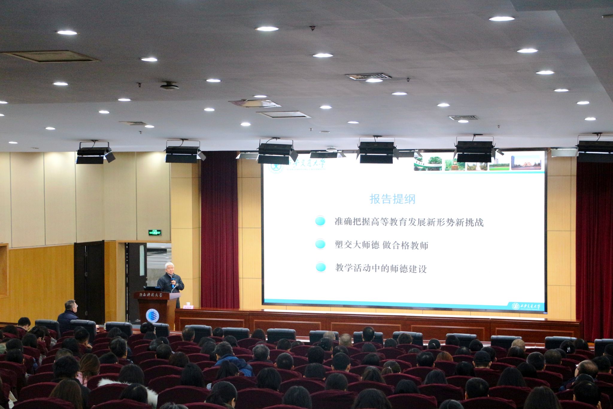 為深入貫徹教育強國戰略部署,加強新時代教師隊伍建設,11月10日下午,我校教師發展中心聯合黨委教師工作部特邀國家級教學名師、西安交通大學徐忠鋒教授做客“名師論壇”,分享《教育強國戰略背景下高校師德師風建設的探索與實踐》專題報告。各學院教學副院長、系主任及教師代表共計350余人參加了報告會。報告會由教師發展中心常務副主任徐永建主持。