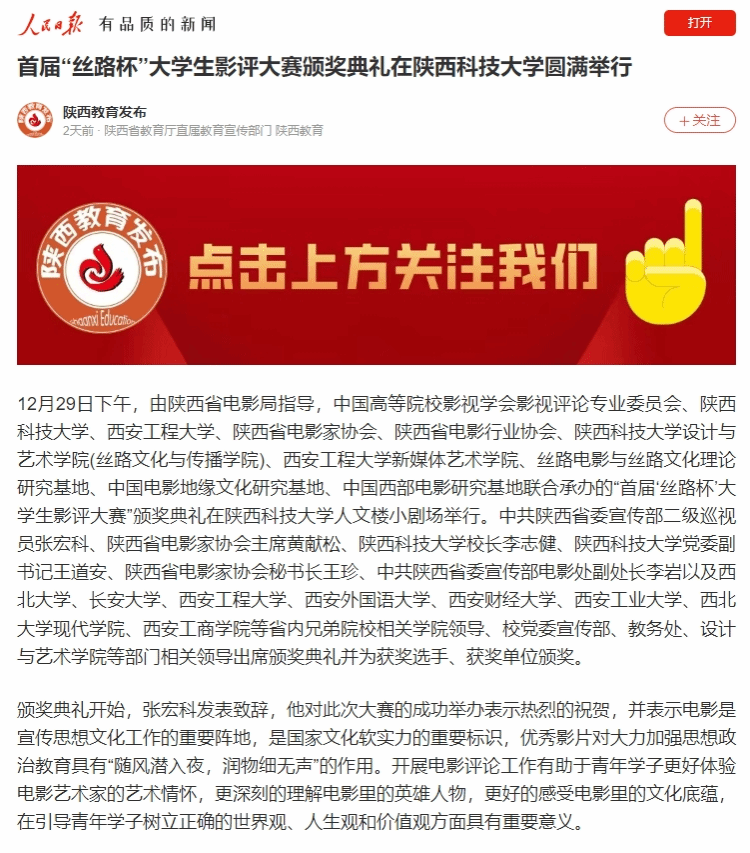 近日,《人民日報》APP、陜西衛視、群眾新聞網、今日頭條、搜狐新聞APP、中國網、文旅中國APP等媒體報道首屆“絲路杯”大學生影評大賽頒獎典禮在我校舉行。