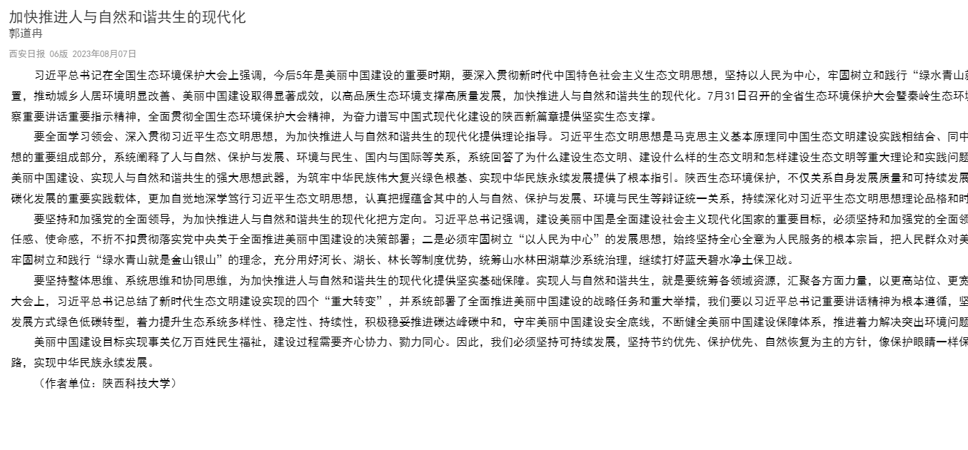 習(xí)近平總書記在全國生態(tài)環(huán)境保護(hù)大會(huì)上強(qiáng)調(diào),今后5年是美麗中國建設(shè)的重要時(shí)期,要深入貫徹新時(shí)代中國特色社會(huì)主義生態(tài)文明思想,堅(jiān)持以人民為中心,牢固樹立和踐行“綠水青山就是金山銀山”的理念,把建設(shè)美麗中國擺在強(qiáng)國建設(shè)、民族復(fù)興的突出位置,推動(dòng)城鄉(xiāng)人居環(huán)境明顯改善、美麗中國建設(shè)取得顯著成效,以高品質(zhì)生態(tài)環(huán)境支撐高質(zhì)量發(fā)展,加快推進(jìn)人與自然和諧共生的現(xiàn)代化。7月31日召開的全省生態(tài)環(huán)境保護(hù)大會(huì)暨秦嶺生態(tài)環(huán)境保護(hù)會(huì)議強(qiáng)調(diào),要深入學(xué)習(xí)貫徹習(xí)近平生態(tài)文明思想和習(xí)近平總書記來陜考察重要講話重要指示精神,全面貫徹全國生態(tài)環(huán)境保護(hù)大會(huì)精神,為奮力譜寫中國式現(xiàn)代化建設(shè)的陜西新篇章提供堅(jiān)實(shí)生態(tài)支撐。