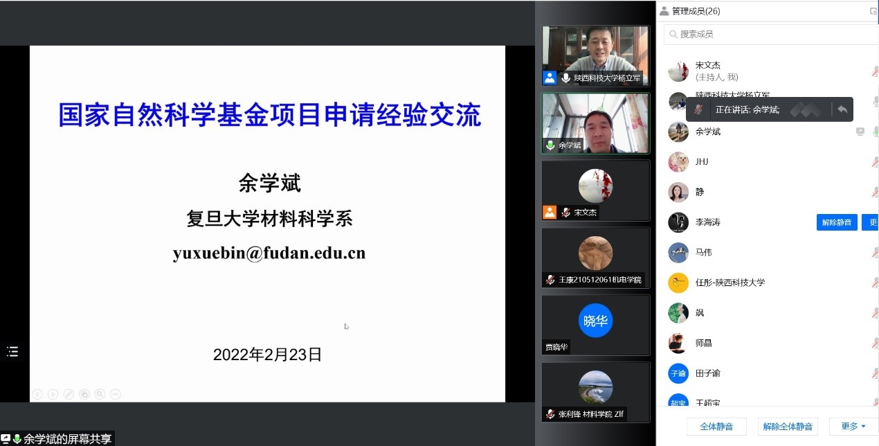 2月23日,應科技處、前沿院和機電學院邀請,國家杰出青年基金獲得者、科技部科技創新領軍人才、中組部“萬人計劃”科技創新領軍人才、國家自然科學基金會評專家、博士生導師、復旦大學材料科學系余學斌教授,作了題為“國家自然科學基金項目申請經驗交流”的前沿科學報告。報告采用線上形式舉行,由機電學院副院長楊立軍主持,機電學院、材料學院60余位教師參會。